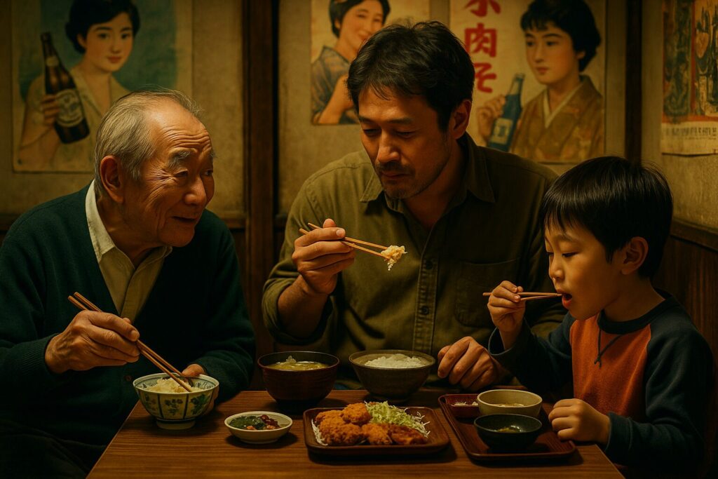 おじさんが昼に生姜焼きを食べ、学生が夜にカツ丼をかき込み、子どもが「ただいま」と言ってのれんをくぐる。