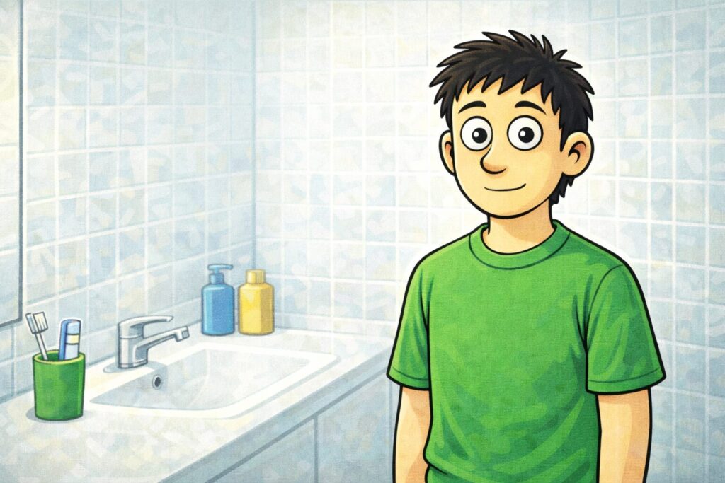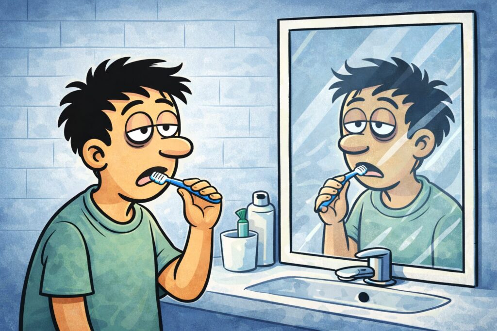朝の洗面所で、いつものように歯を磨きながら鏡を見ていたとします。