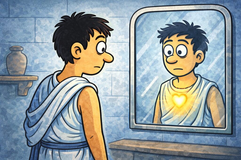 水面に映る自分の姿に惹かれ、そこから離れられなくなったナルキッソスの神話がありますが、あれは単なる自己陶酔の物語ではありません。