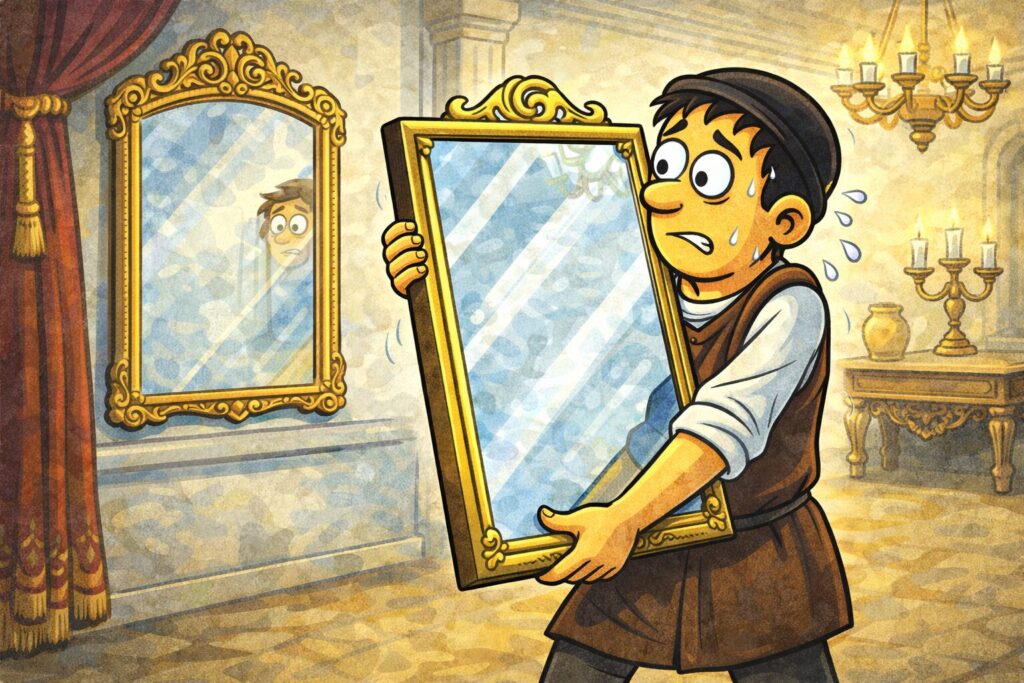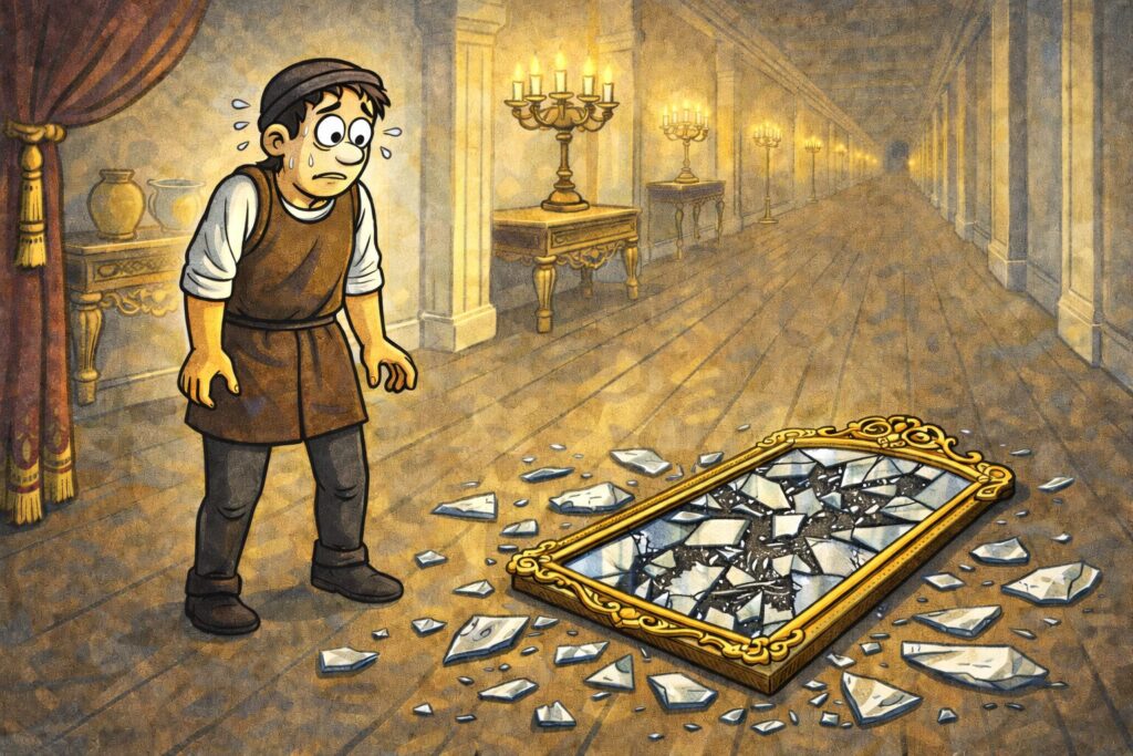 まるで鏡のほうが、「これは物損で済む話だと思っているのか」と問いかけてくるようです。