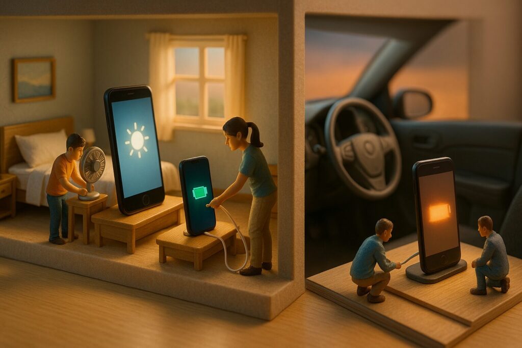 夏の車内や布団の上での充電は、まるでサウナの中で熱湯を注ぐようなもの。