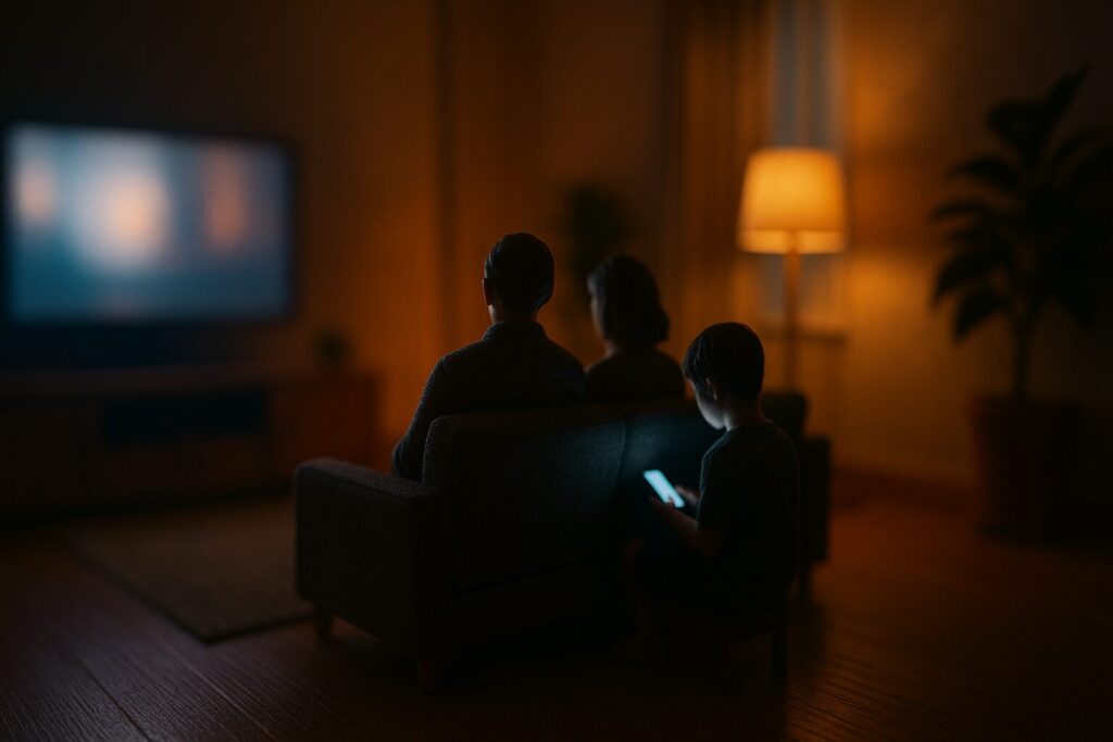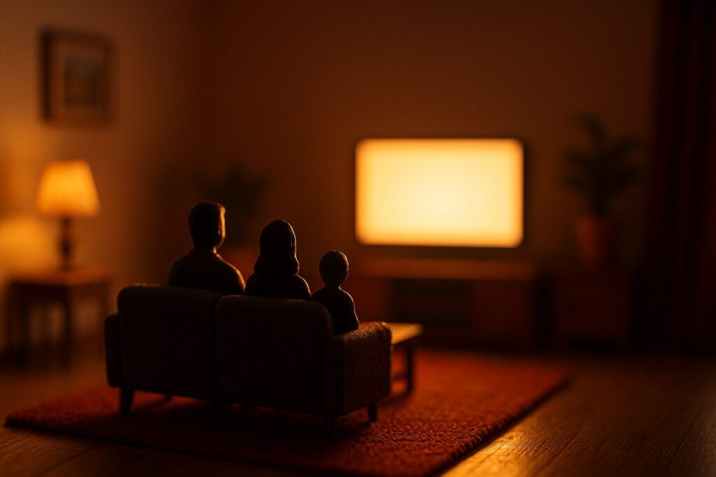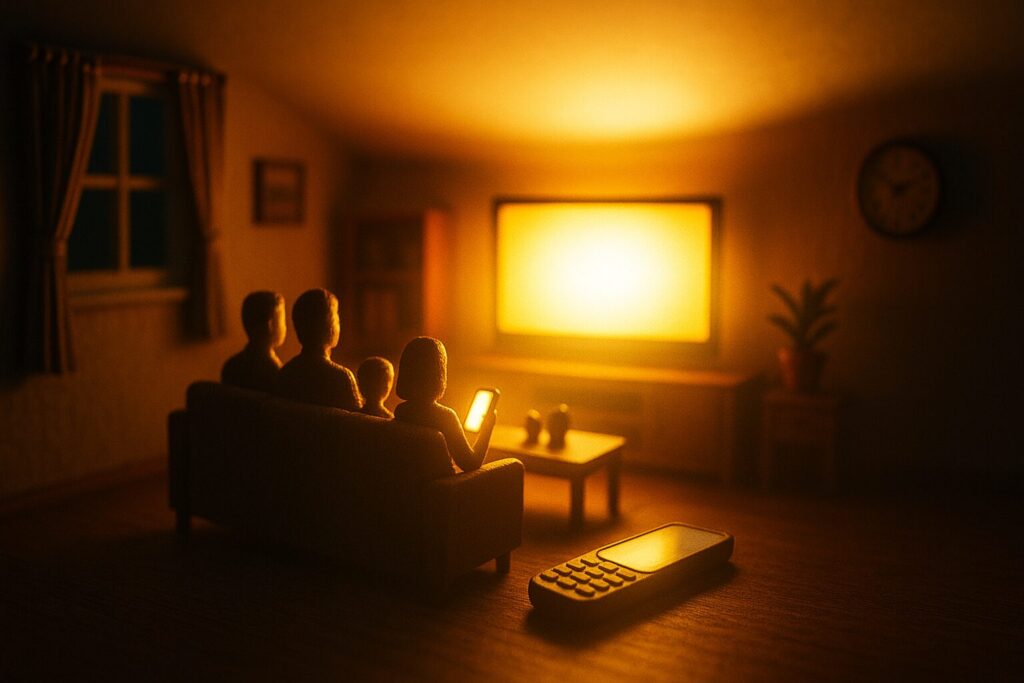 家族がリビングに集まり、同じ番組を一緒に笑って観る