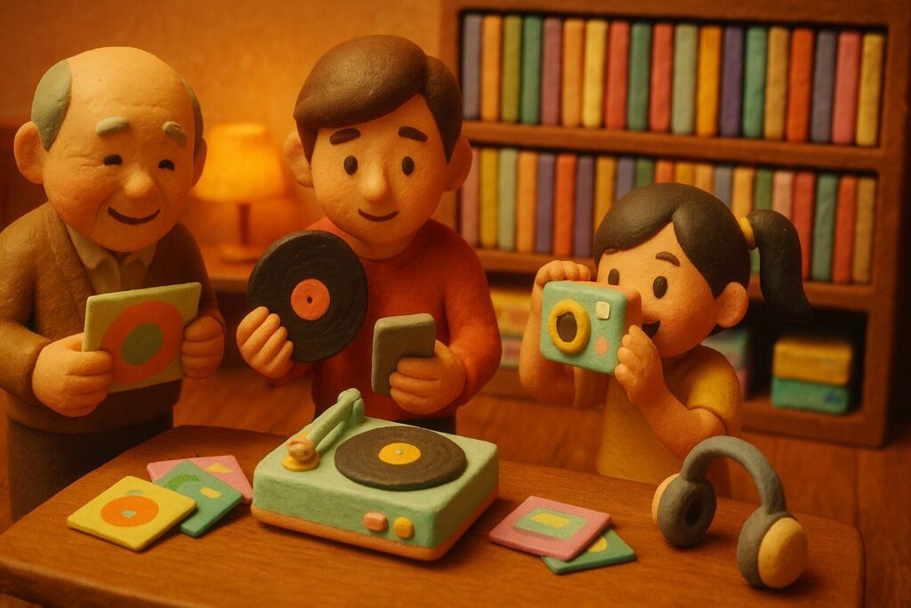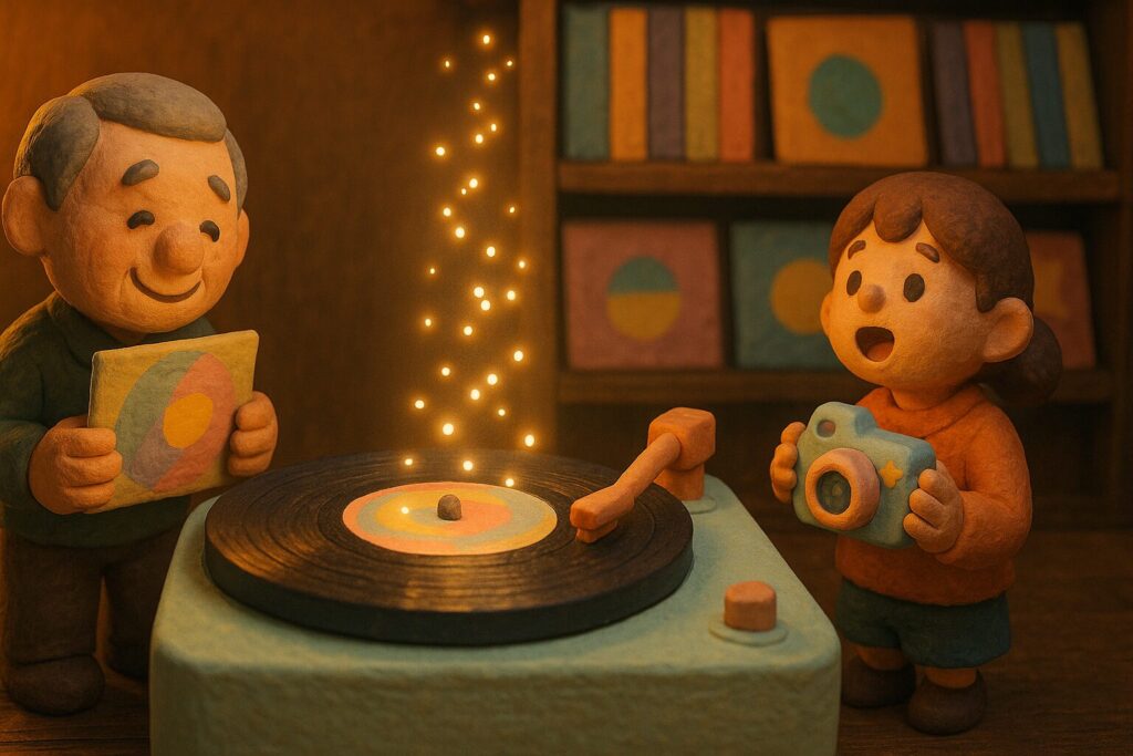 レトロな喫茶店、フィルム写真、古いパッケージ、レコードのジャケット。