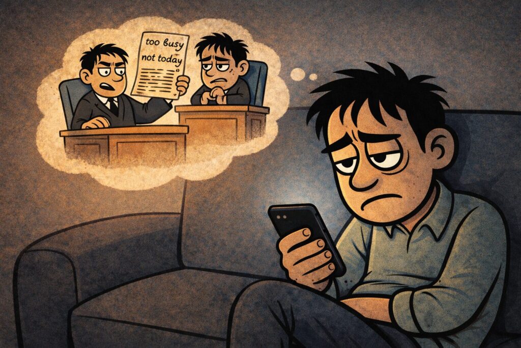 ソファに深く沈み込み、スマホを握りしめ、裁判官のような顔で判決を下します。