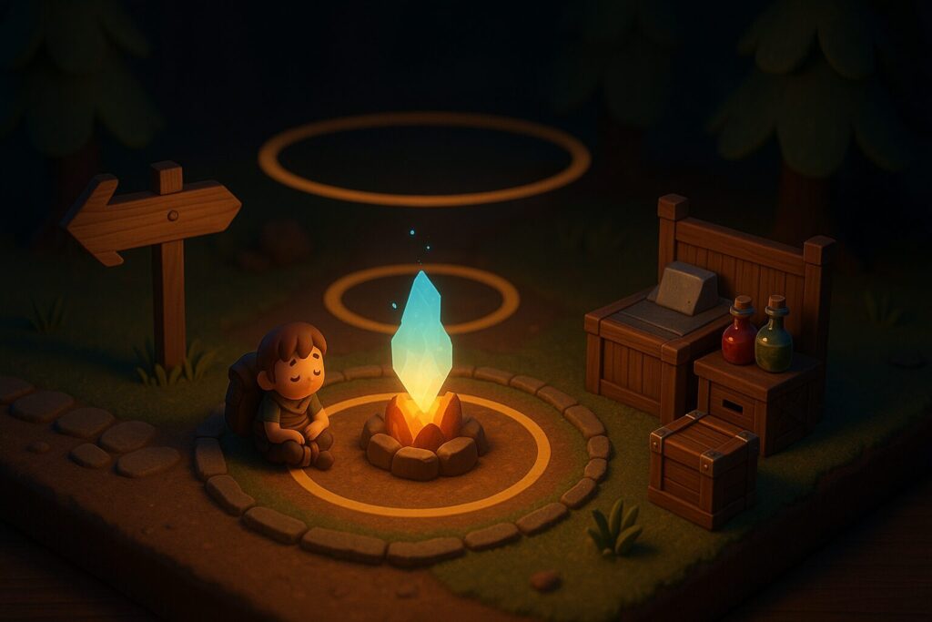 説明文なんて出さなくても、焚き火を置くだけでプレイヤーは勝手に安心してくれる。