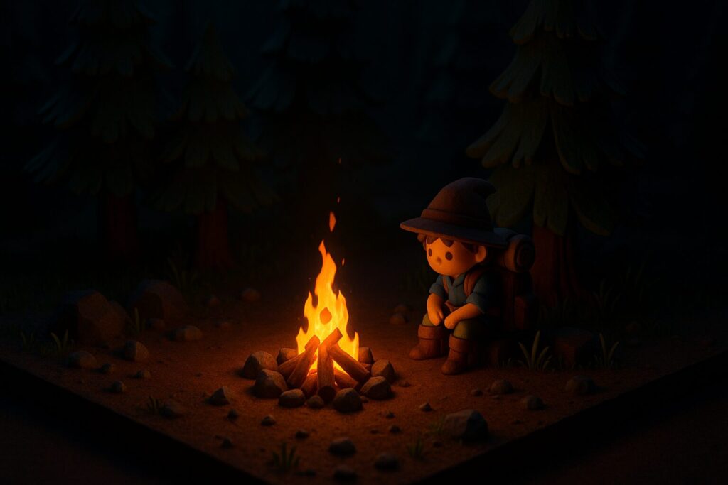 暗い森の中でも、焚き火の光が届く範囲だけは「安全圏」