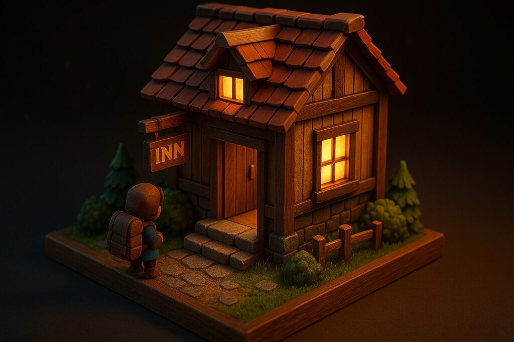 だからこそ、遠くに焚き火の光が見えたり、見覚えのある宿屋の看板が見えたりすると、それだけで安心する。