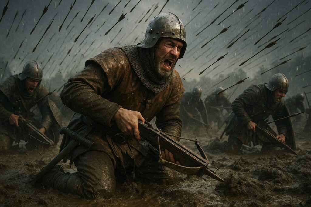 しかし泥濘の戦場で、長弓隊との射程差や発射速度差に苦しみ、さらに本来なら矢を防ぐための大盾(パヴィス)が後方の荷車に置き去りにされて戦場に届かず、無防備のまま矢の雨に晒されて大混乱となりました。