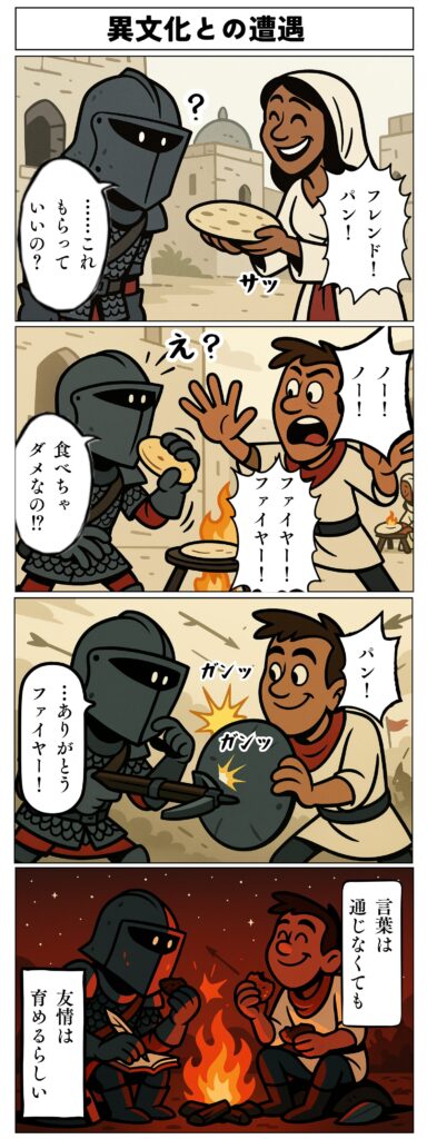 遠征のたびに国境を越え、異国の言葉や食べ物、戦い方に触れながら生き延びる術を磨きました。