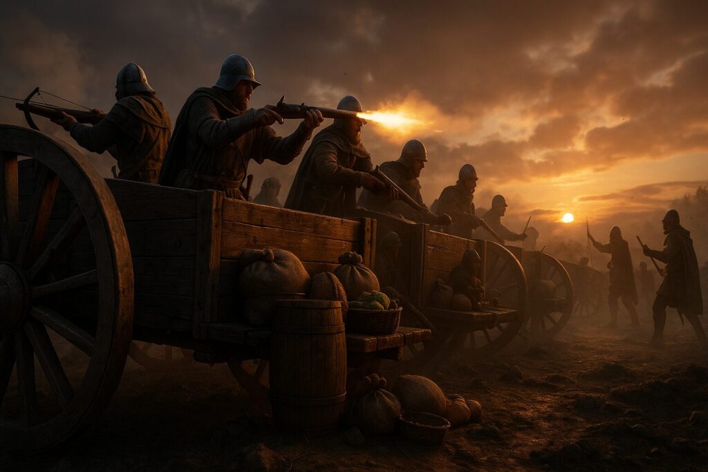 フス戦争(1419–1434年)では、ボヘミアの歩兵が荷車を鎖で連結して防御線とし、弩や火器を組み合わせる戦術を確立しました。