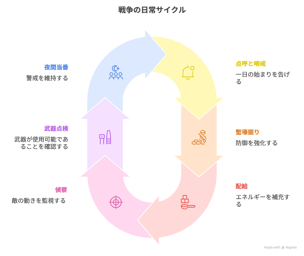 夜明けの点呼と哨戒、午前の塹壕掘りや攻城器の整備、正午の配給、午後の偵察・交渉使の往復、日没前の武器点検と火の管理、そして夜間当番の輪番。