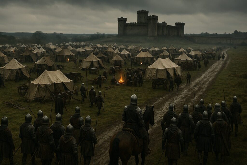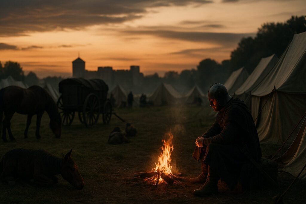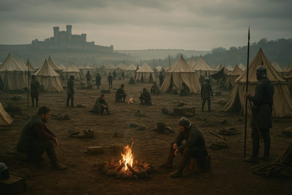 攻め手は野営地を築き、補給路を押さえ、見張り・工事・交渉を回し続けます。
