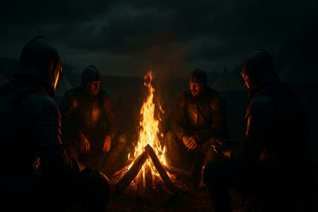 火の明かりに照らされた顔には、敵でも味方でもない、ただ“生きている”人の表情が浮かんでいました。