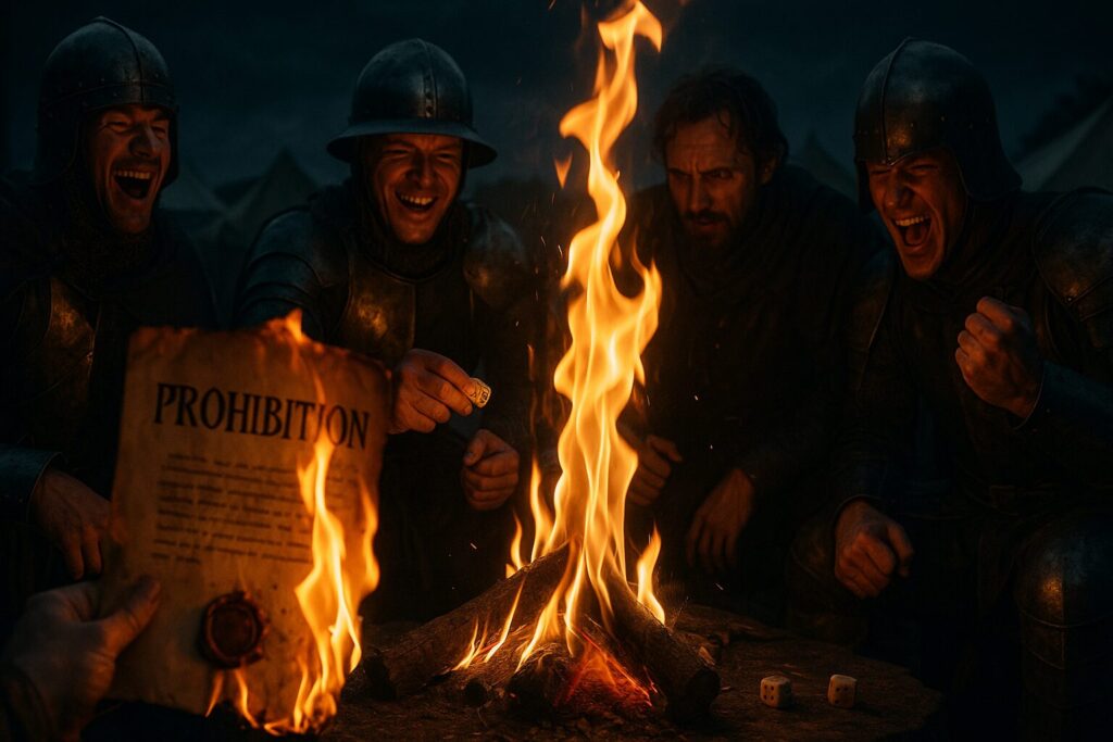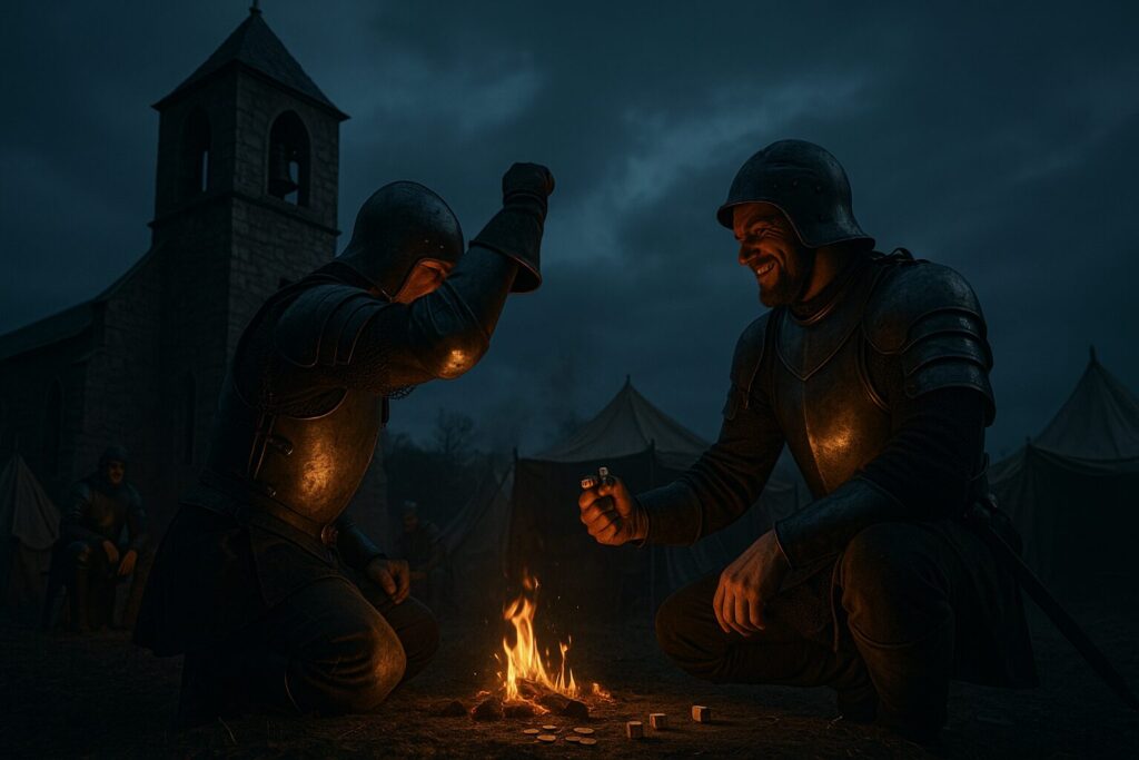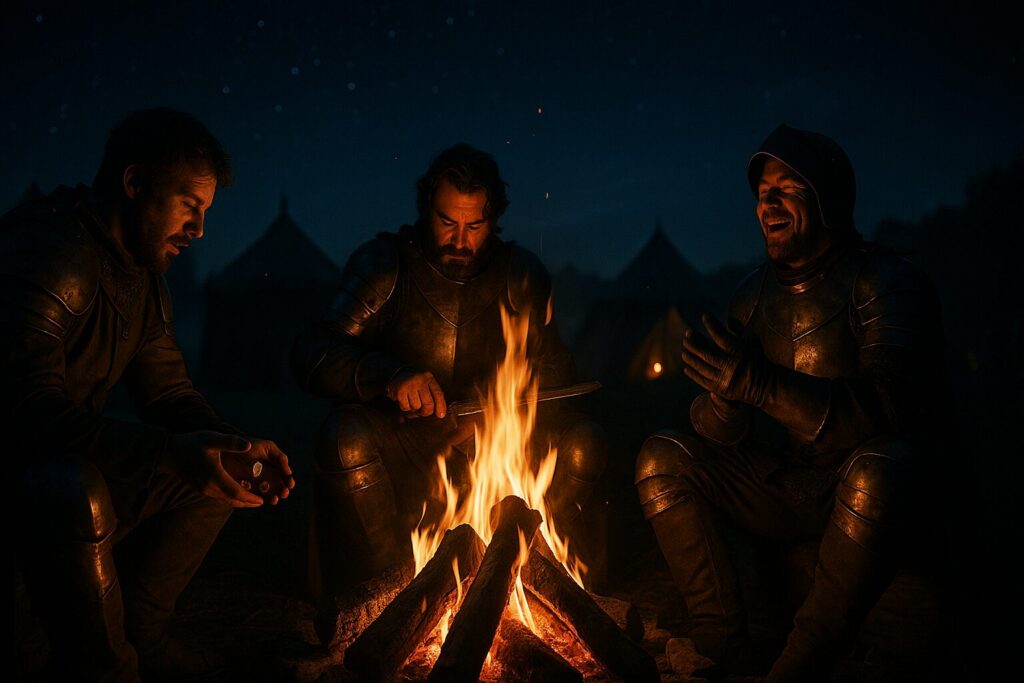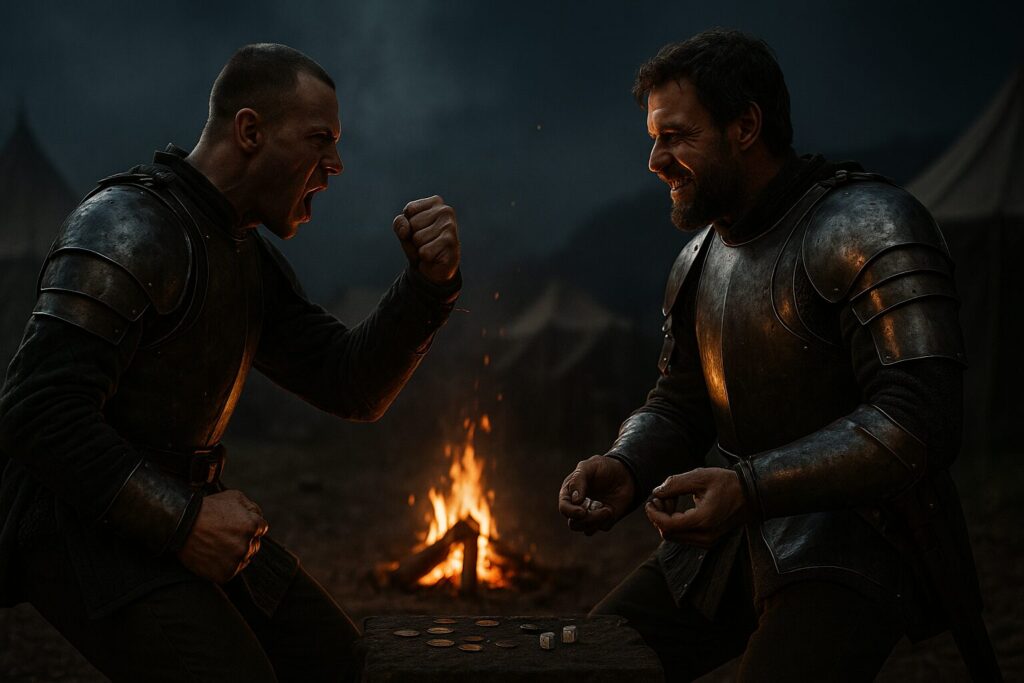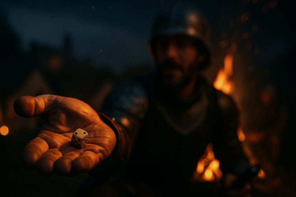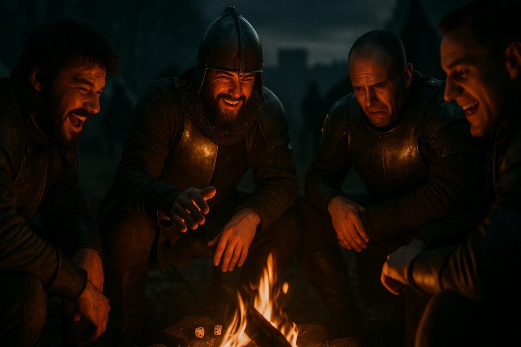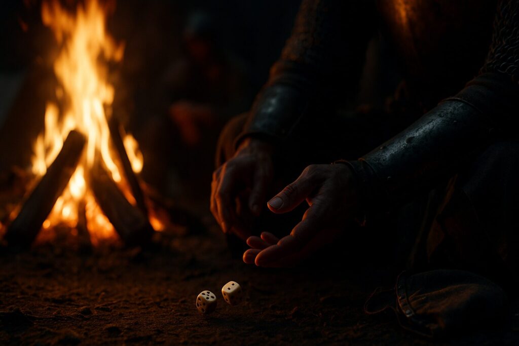 戦場の夜、焚き火の明かりに照らされながら、兵士たちの手の中でサイコロが音を立てて転がる。