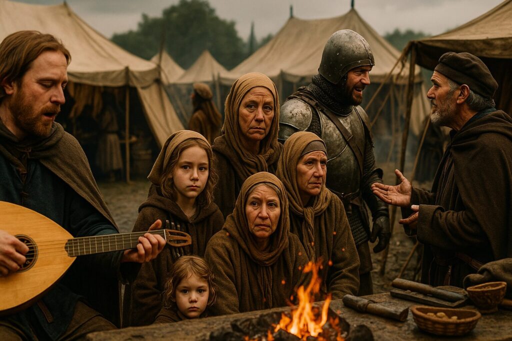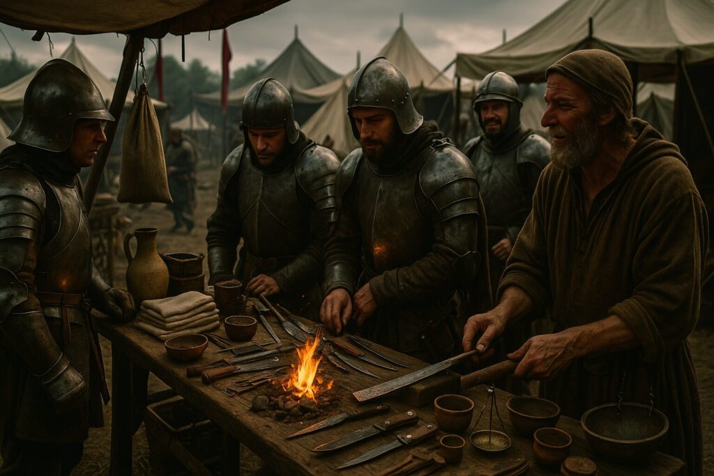 パンや酒が売られ、鎧が修理され、即席の市場が立ち上がる。