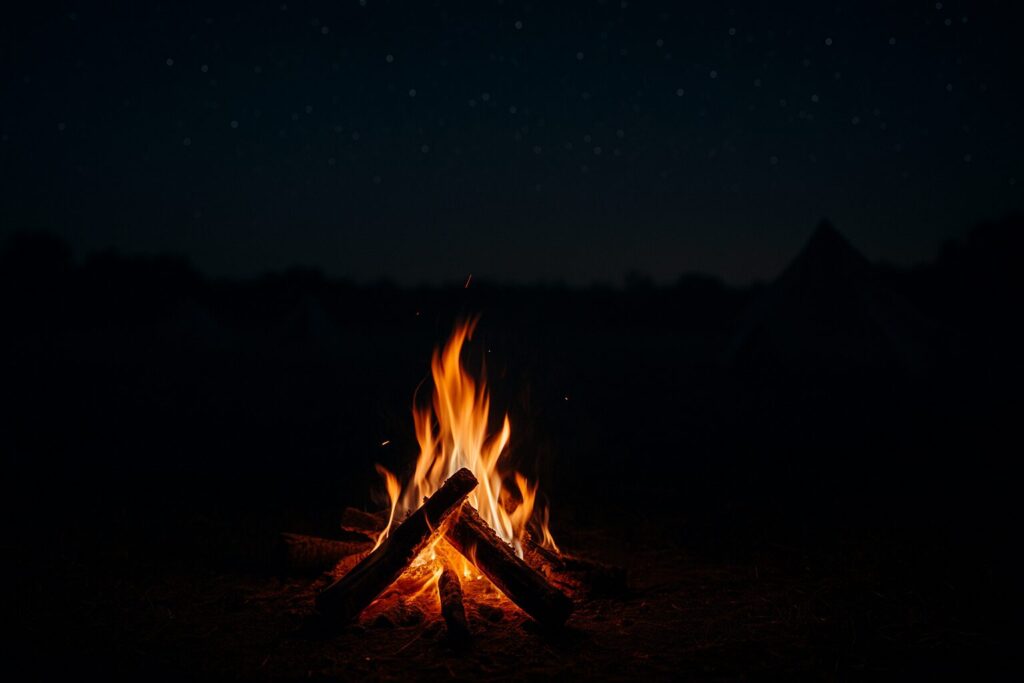 焚き火の明かりの中で