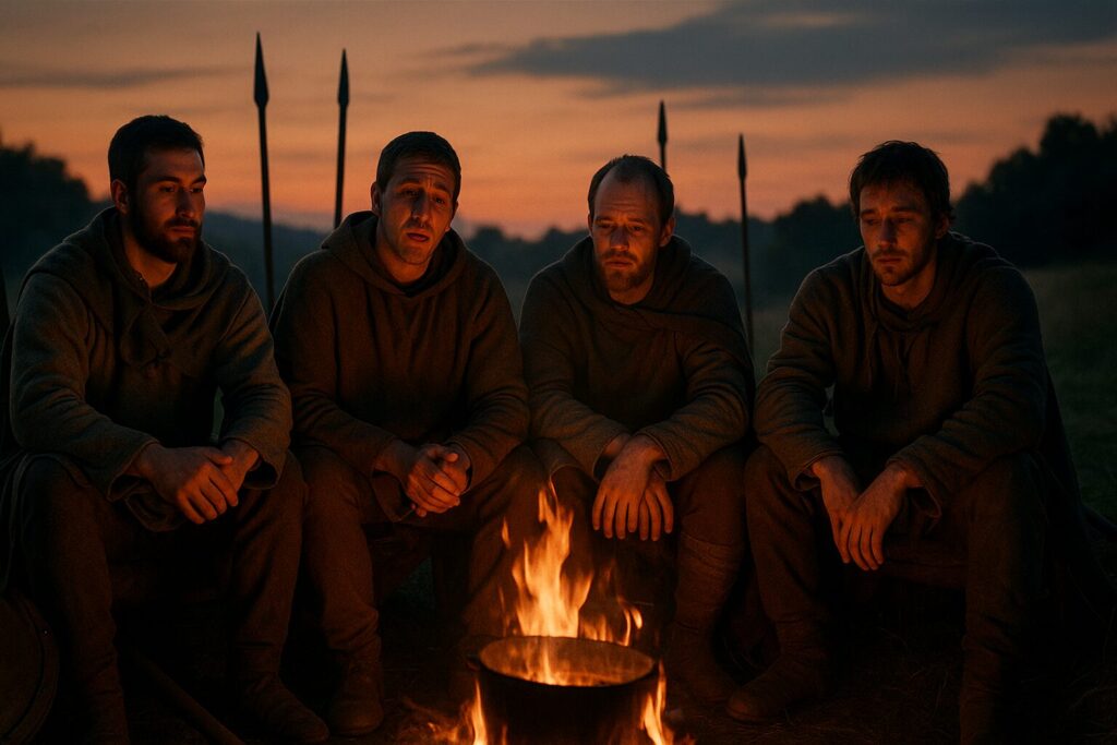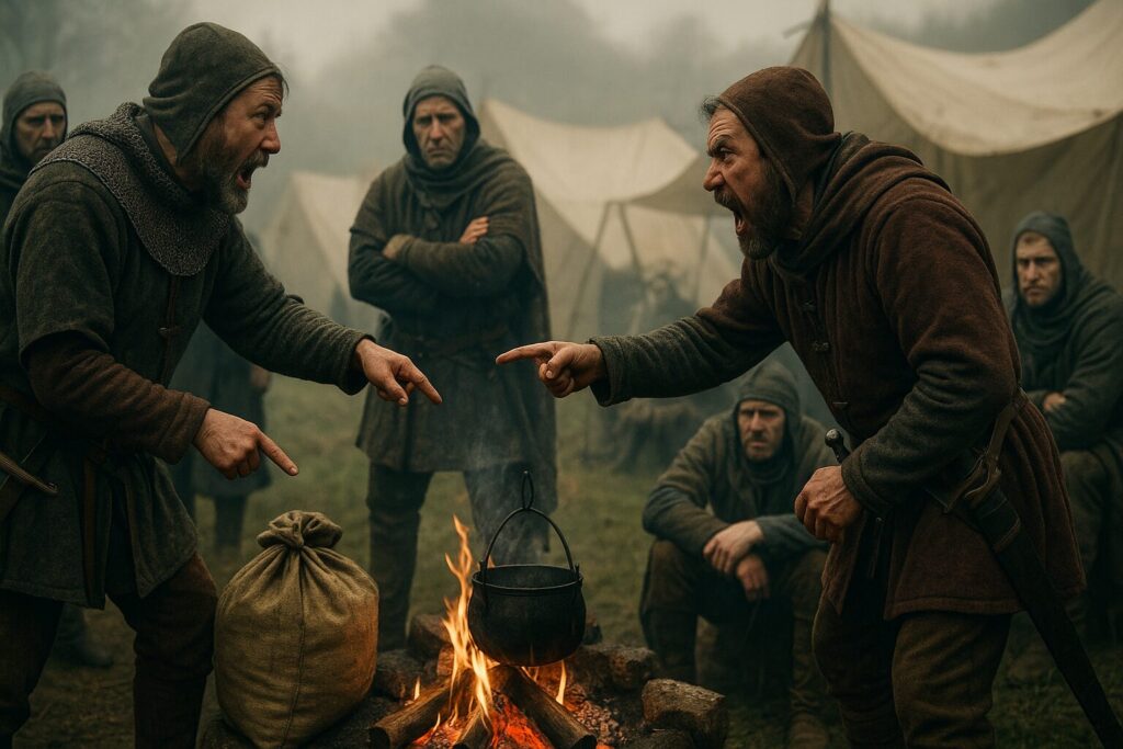 野営地では、鍋の取り分をめぐって空気が悪くなり、サイコロ賭博で声が荒くなり、戦利品の分配で険悪になります。