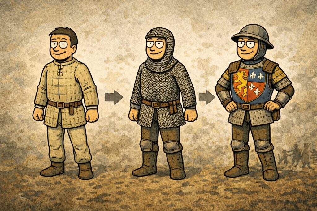 よくある誤解が「中世の兵士=全身鉄の缶詰」というイメージですが、現実はかなり違います。