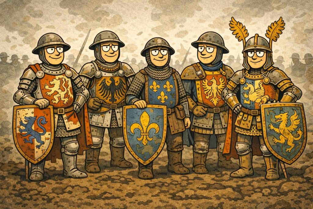 これらを一瞬で判断する必要があったため、兵士たちは鎧や兜、盾や上着にさまざまな紋章や色をまとっていました。