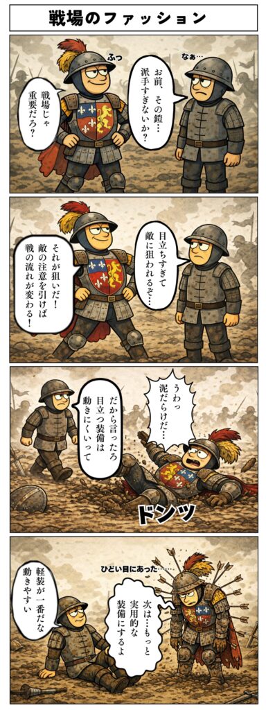ここまで読むと、中世の戦場は理不尽で過酷で、しかもオシャレに厳しい世界だったと分かります。