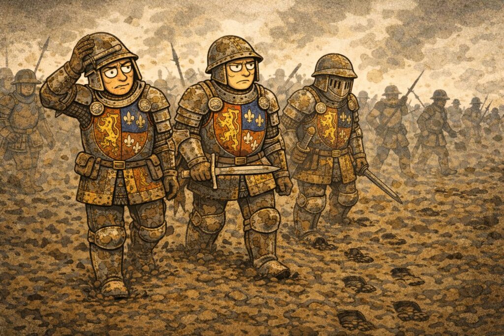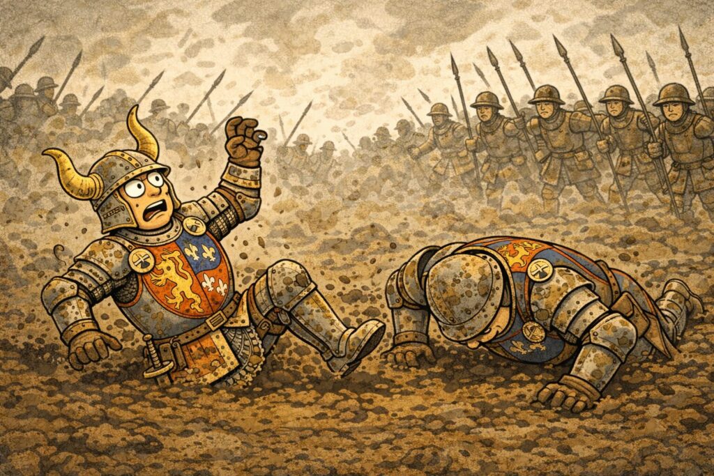 有名なアジャンクールの戦いでは、膝まで沈む泥の中で重装備の兵士たちが次々に転倒。