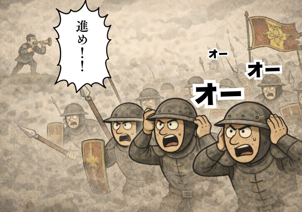 これ、敵を脅すためだけじゃなく、実務的には味方識別・士気・集合“音の旗印”として働きます。