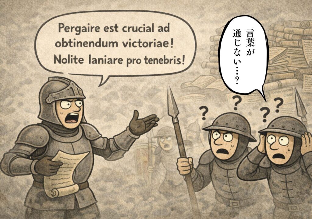 映画やゲームで、鎧の騎士がラテン語っぽい決めゼリフを叫ぶ場面を何度も見てきたから。「それっぽい言葉=中世」という刷り込みがあるんですね。