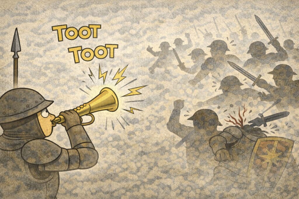 (中世ど真ん中からは少し外れますが)後の時代には、敵を混乱させるために「退却の合図」をわざと鳴らして、相手を引かせた――なんて話まで出てきます。