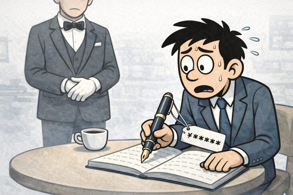 ところが一行目を書き終えたところで、隣の客が言いました。